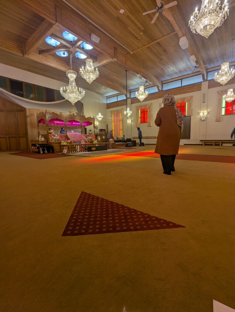 We were welcomed at the door by someone who showed us where to remove our shoes, wash our hands and put on a head covering. Before we could enter the main worship space of the gurdwara, we had to wait for about 300 people to exit the room. It was a celebration of a couple’s 25th wedding anniversary. I don’t know as many people as I saw stepping out of that room.