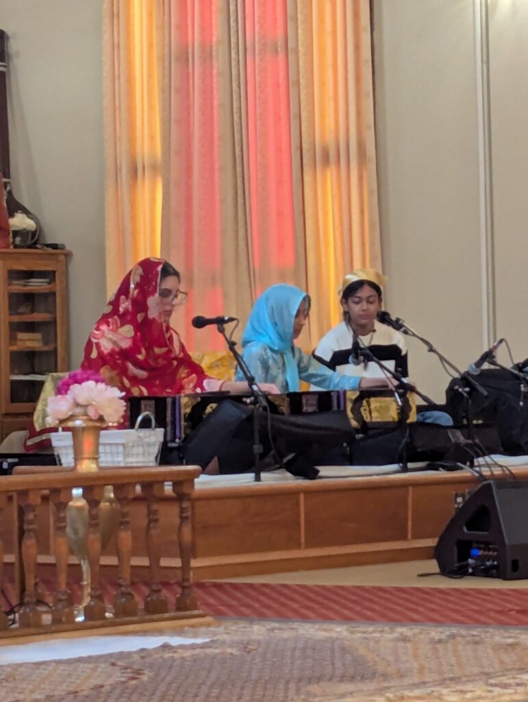 As we entered the room, we were invited to participate in a ceremony of kneeling and touching our heads to the floor in front of the Guru. We learned that the Sikh religion began with the leadership of 6 teachers whose words and wisdom were recorded over time. At some point, it was determined that there would be no more human gurus but that the cumulative writings were considered to be the Guru for the Sikh people. We were invited to ask questions and were delighted to experience three young women playing the harmonium and singing.