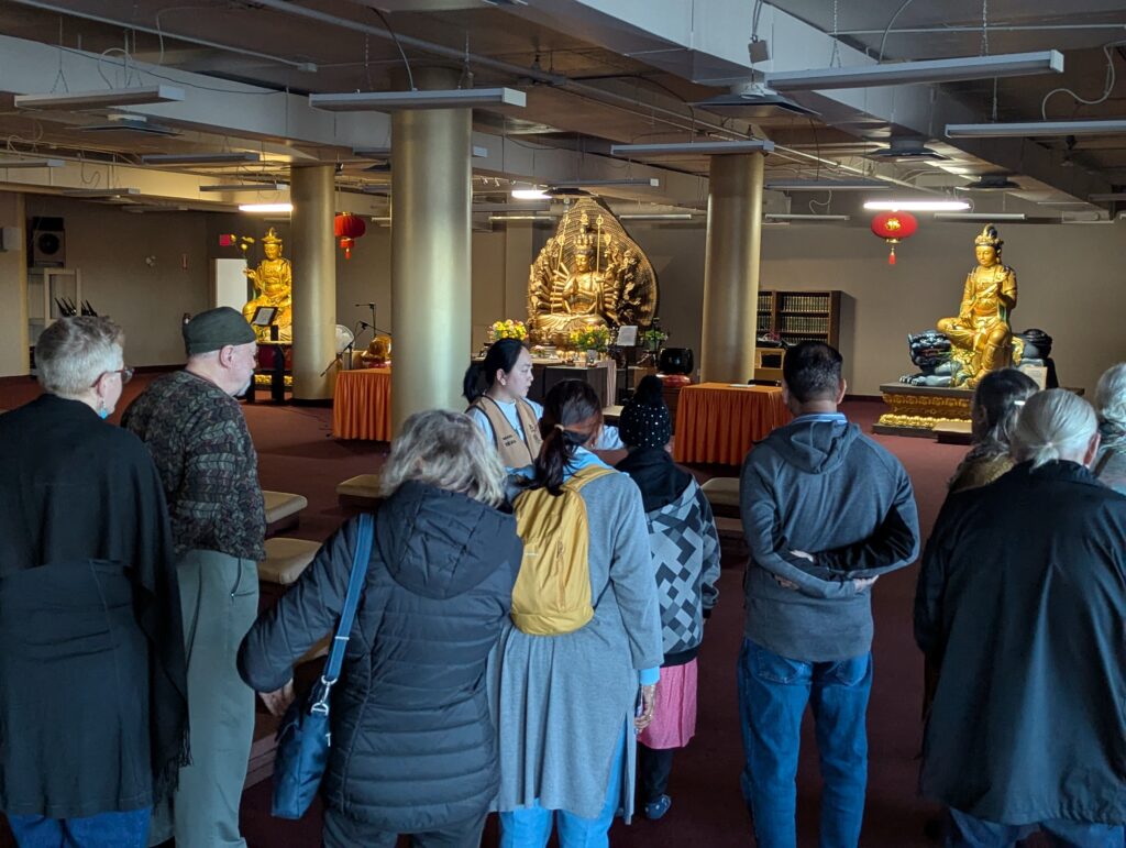 The timing of our visit was in some ways out of sync and in other ways perfectly timed. The leaders of the monastery were in the Buddha Hall chanting. The community was engaged in day 6 of a 7-day chanting ceremony, so when we arrived, we were greeted by a volunteer who gently and graciously toured us around the space on the 4th floor. The Buddha Hall is a high-ceilinged space with 10,000 plaster Buddhas set into the upper walls and three large statues of the Buddha at the front.