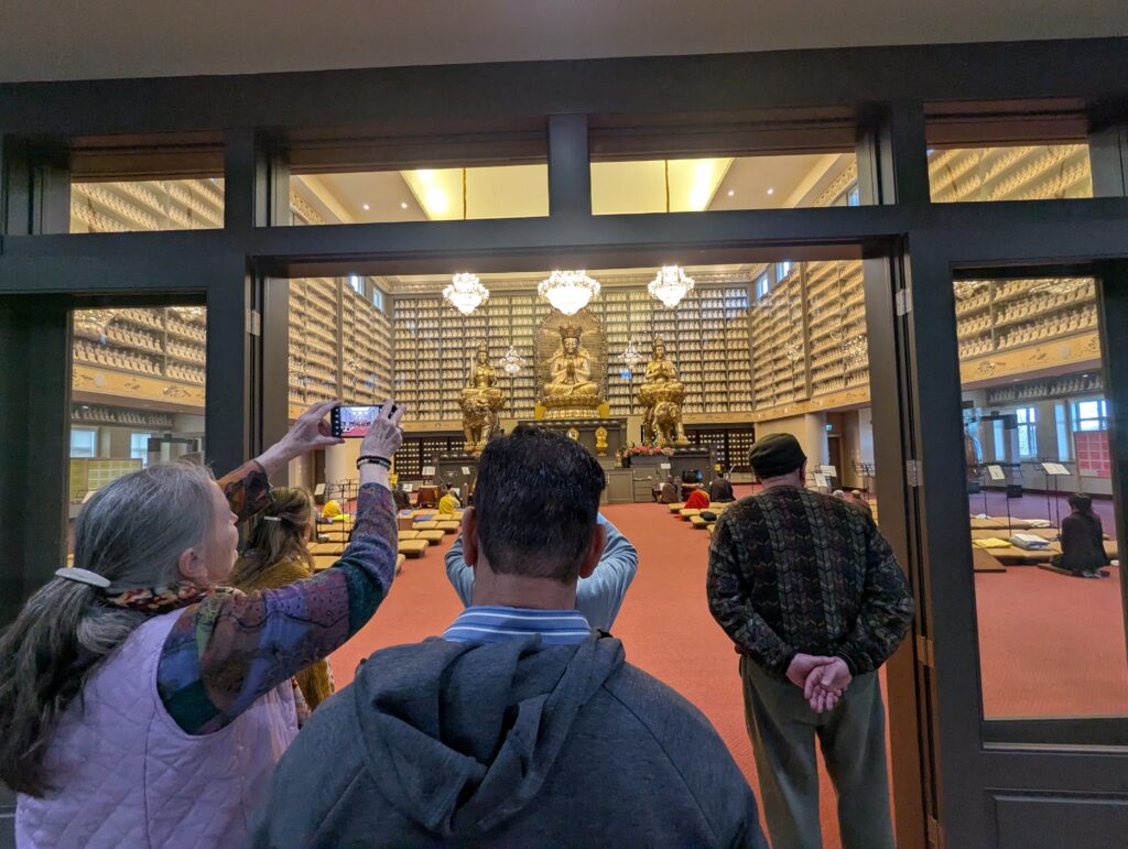 As I was moving slowly around, I noticed Linda, one of the women on the tour, tearing up. Her face was soft and wet. As I looked at her with concern, she indicated she was okay. Later, on the bus, she shared that she was born deaf in one ear. Three years ago, she received cochlear implants. Linda still has occasions when she hears things she has never heard before. When this happens, it just takes her over. Being in the space of the Buddha Hall, hearing the water and listening to the chanting and seeing all the pervasive strong visual images was an immersive experience for her.